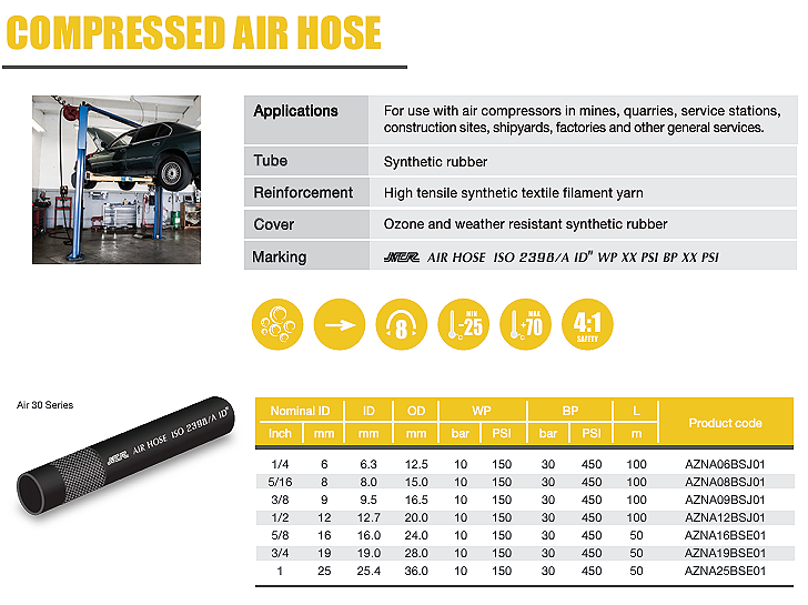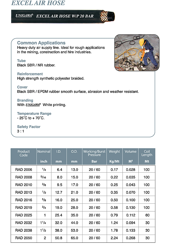 Medium duty air hose for transfer of compressed air in mining, construction, hire and general industry applications.