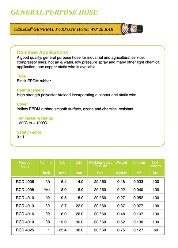 Suitable for industrial and agricultural service, compressor lines, hot air & water, low pressure spray and many other light chemical application.